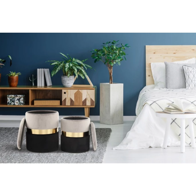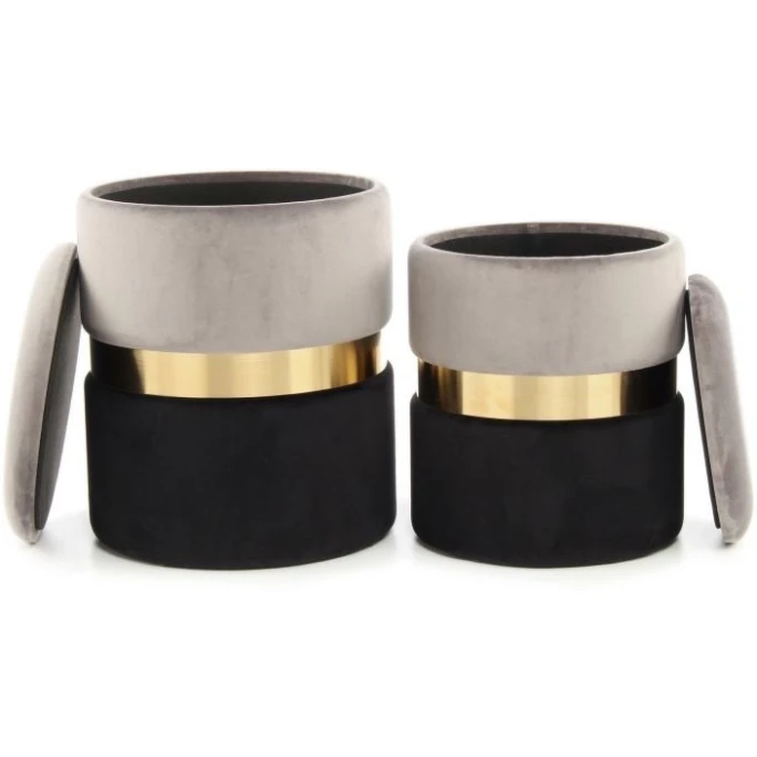 Mit diesem Set erhalten Sie zwei Hocker in unterschiedlichen Größen, aber gleichem Design. Die moderne zweifarbige Gestaltung erhält durch einen edlen Ring aus Metall einen glamourösen Charakter. Die beiden Farben werden durch den Ring optisch voneinander getrennt und bilden dennoch eine harmonische Einheit. Durch den samtweichen Bezug aus Stoff und die runde Form wirken die Hocker bereits optisch weich. Auch in Sachen Komfort steht es den Hockern in nichts nach. Die Sitzflächen sind weich gepolstert und bieten so eine angenehme Sitzgelegenheit, die in jedem Raum genutzt werden kann. Als Sitzmöglichkeit an niedrigen Tischen, wie Couchtischen, kann ein Hocker beispielsweise optimal genutzt werden. Zwei zusätzliche Sitzgelegenheiten für Besucher sind durch diese Hocker immer gegeben. Wird der Platz anderweitig benötigt, lassen sich die Hocker dank des leichten Gewichts bequem umstellen oder platzsparend zur Seite stellen, sodass sie bei Bedarf wieder herausgeholt werden können. Der besondere Clou an diesen Hockern ist der Stauraum im Inneren. Der Kayoom HOCKER Zora 125 2-er Set lässt sich durch die abnehmbare Sitzfläche einfach zur Aufbewahrung gerade nicht gebrauchter Gegenstände nutzen. Nutzen Sie den Hocker als Sitzgelegenheit, als Fußablage oder als Aufbewahrungsbox und erfreuen Sie sich an dem praktischen und zugleich dekorativen Möbelstück.