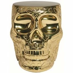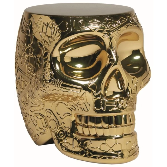 Qeeboo ist eine italienische Marke, welche 2016 von Stefano Giovannoni gegründet wurde und die hochwertige Möbel sowie extravagante Accessoires herstellt. Dabei handelt es sich um außergewöhnliche Objekte, die unter der sorgfältigen Leitung von Stefano Giovannoni in Zusammenarbeit mit den vielseitigsten internationalen Designern geschaffen wurden und verschiedene Stile sowie Charaktere in einen spielerisch-narrativen Ansatz integrieren. Der moderne Stuhl Mexico wurde von Studio Job für qeeboo entworfen und besticht durch die fulminante, skulpturale Totenkopf-Form. Der beeindruckende Schädel ist mit mexikanischen Grafikmusterungen kunstvoll verziert, welche symbolisch dafür stehen, den Tod auszutreiben und das Leben zu feiern. Alternativ kann das opulente Design-Objekt auch als Beistelltisch verwendet werden. Darauf lassen sich Snacks und Getränke servieren oder ein Pflanzgefäß in Szene setzen. Der hochwertige Hocker besteht aus langlebigem Polyethylen (thermoplastischem Kunststoff) und ist mit einem glänzenden Metall-Finish veredelt. Mit dem außergewöhnlichen Stuhl/Beistelltisch Mexico von qeeboo sorgen Sie überall für ein aufregendes Ambiente. Wir bieten Ihnen das dekorative Wohnaccessoire in verschiedenen Farbvarianten in unserem AMBIENDO Shop an. Gönnen Sie sich etwas Extravaganz!